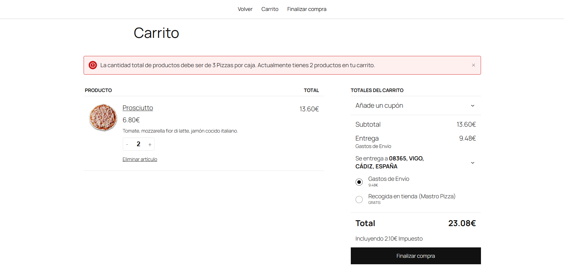 Para poder realizar el pago de tu pedido, necesitas hacer un pack de 3 pizzas, lo que correspondería a "1 caja" para SEUR. el pack puede ser combinado con cualquiera de nuestras pizzas disponibles en nuestra tienda virtual.
